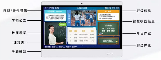 隨著數字信息化的進步,智能信息化技術在我們日常生活應用越來越廣,越來越多學校開始智慧校園建設,智能電子班牌作為信息發布載體,主要以高清顯示、數據共享、數據管理為主,可以進行刷卡考勤,校園信息發布、班級信息展示,數據實時傳輸到管理后臺,學校統一管理,學生家長也能了解孩子在校情況。
